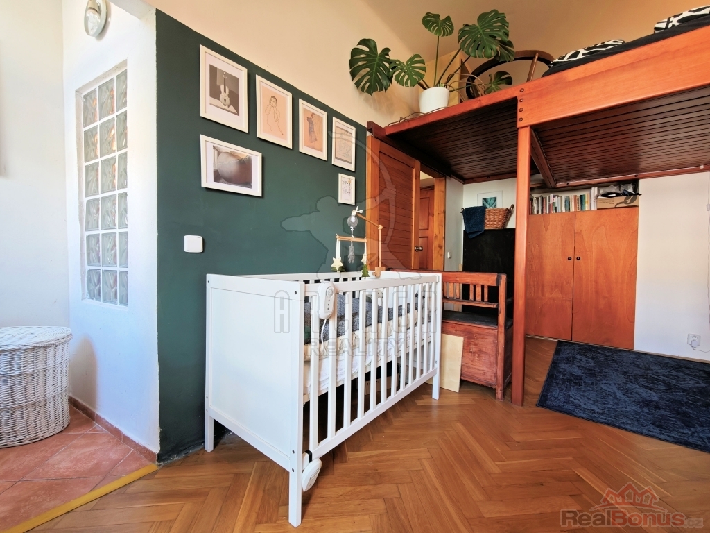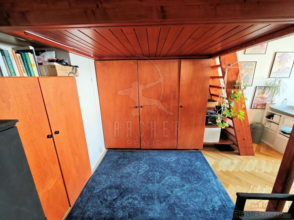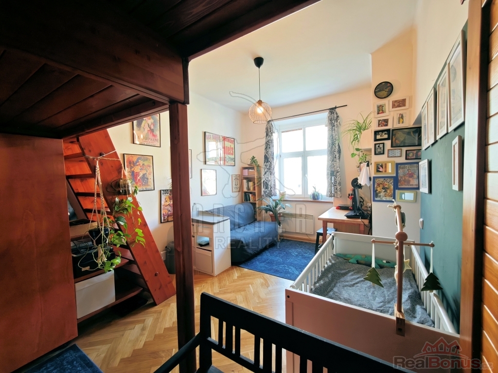 Byt nabízí prostornou vstupní předsíň, obývací pokoj s plně vybaveným novým kuchyňským koutem z roku 2024 (indukce, elektrická trouba, digestoř, myčka, pračka, vestavěná lednice s mrazákem), neprůchozí pokoj/ložnici s vestavěnou skříní a dřevěným patrem ke spaní (výška stropu 3m) se vstupem na nevelkou lodžii. Díky promyšlenému využití prostoru bytu majiteli působí byt velice útulně a vkusně. Koupelnu tvoří rohová vana s umyvadlem, společně s toaletou (zděné jádro). Zabudované luxfery efektně prosvětlují prostor rekonstruované koupelny ( rok 2023). Podlahovou krytinu tvoří renovované parkety, vinyl a dlažba. Plastová okna s dvojsklem. Nové rozvody elektro. Vytápění zajišťují elektrické přímotopy, ohřev vody bojlerem. Severo/západní orientace bytu. Součástí bytu je rovněž čistá a suchá sklepní koje v suterénu domu. Nízké provozní náklady. K dispozici společná kočárkárna. Benefitem pak udržovaný, klidný vnitroblok se zahradou k posezení.