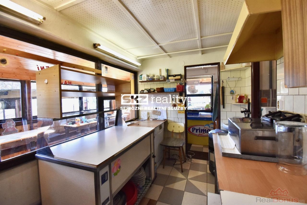 Základem všeho je zděná stavba, kde najdete vše, co k provozování hostinství potřebujete. Dispozice jsou znázorněny na fotografii půdorysu. Zadním vstupem se dostanete do chodby. Vlevo se nachází 2 prostory: WC s umyvadlem a kuchyně. Vpravo je přípravna, čep s výdejním okénkem a prostor pro výdej zmrzliny. Výdej jídel, fritéza, konvektomat, mikrovlná trouba atd. je největším pracovním prostorem a je na konci chodby s výdejním oknem do prostoru uzavřeného posezení pro hosty. Dispoziční uspořádání stavby je deální pro rychlou a pohodlnou přípravu jídel a nápojů se snadným obstaráváním hostů. Na severovýchodní straně se nachází přístavba, kde najdete WC pro hosty a sprchový kout pro personál. Součástí nabídky je mj. vagon, karavan, dva prodejní stánky a 2 foliovníky. Lze využít i studnu pro čerpání užitkové vody.