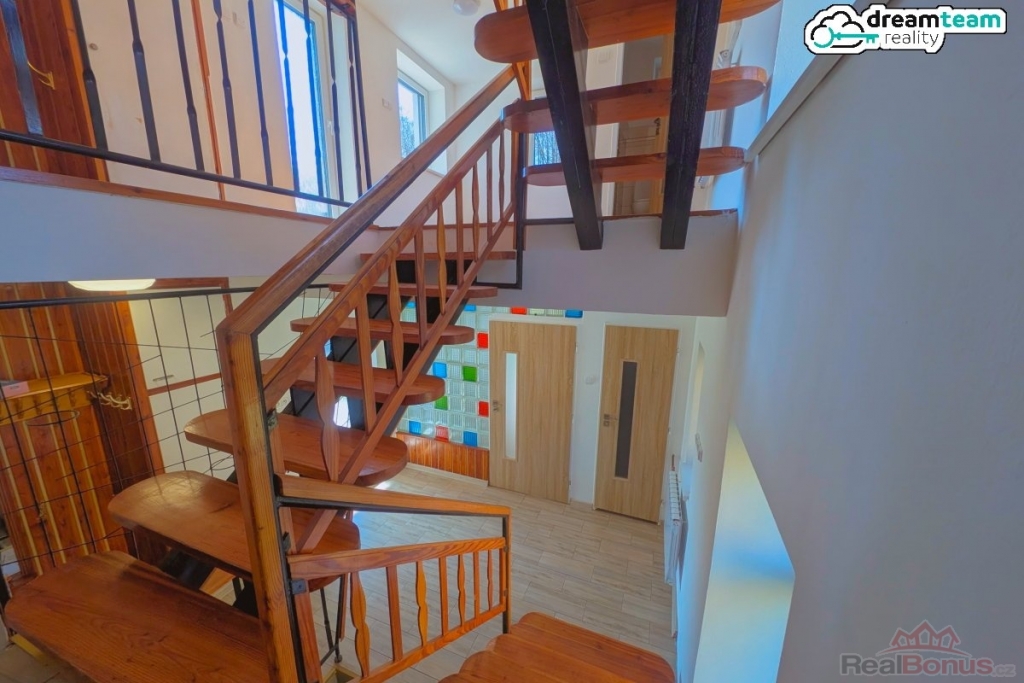 Přízemí nabízí kompletní byt 2+1+jídelna se zrekonstruovanou kuchyní, koupelnou a toaletou ? ideální třeba pro rodiče bez nutnosti chodit do schodů. V patře čtyři místnosti, druhá koupelna a toaleta. Druhá kuchyň by se tu dala vybudovat. Každé patro má balkón orientovaný na jihozápad, oba cca 6 m2, spodní zastřešený ? kafíčko za každého počasí.
