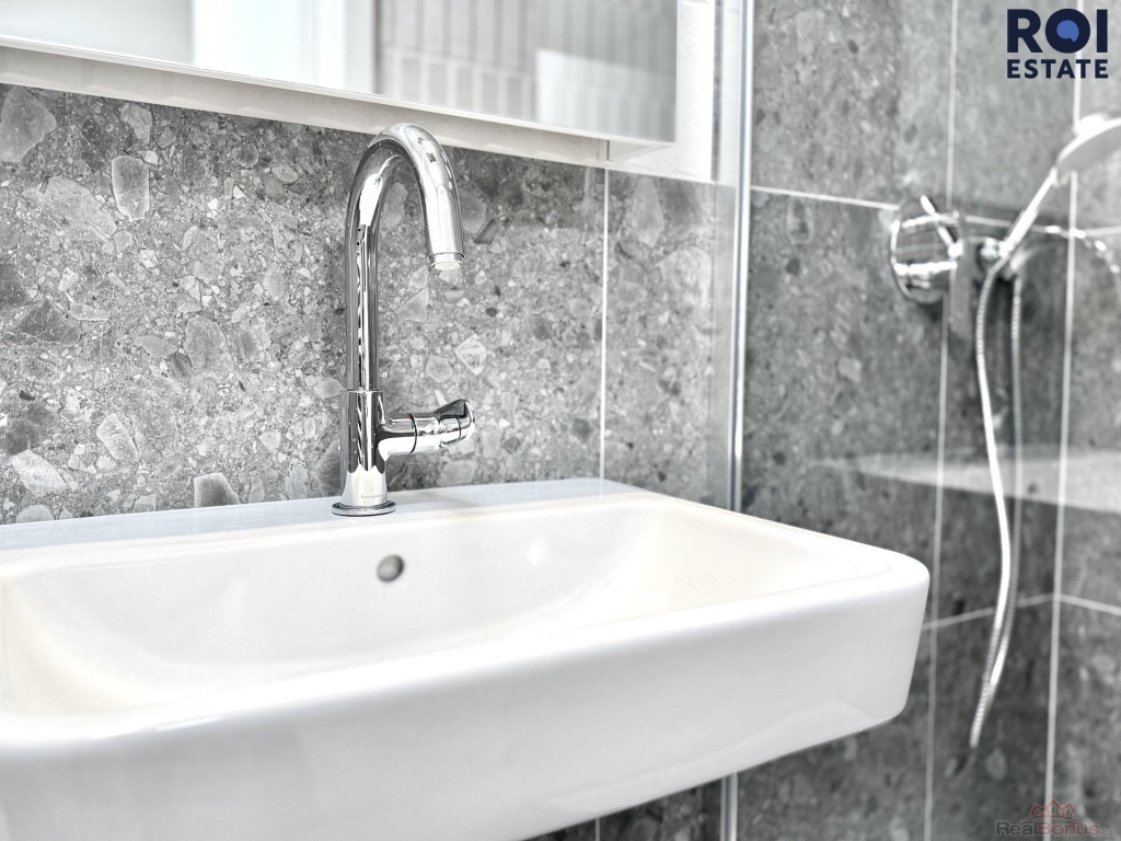 Hned u vstupu vás uvítá světlá předsíň, kde najdete stylový dřevěný policový regál, který skvěle poslouží pro uložení kabátů, bot nebo vašich oblíbených dekorací. Koupelna je pak skutečnou oázou elegance. Je obložená velkoformátovou dlažbou v dekoru kamene a nabízí prostorný sprchový kout se skleněnou zástěnou, designové umyvadlo a toaletu. Celý prostor doplňuje zrcadlo s integrovaným LED osvětlením a kvalitní dřevěná plovoucí podlaha, která celému ateliéru dodává útulnou atmosféru. Výhodou mlže být i to, že prostor je jinak nezařízený, což vám dává absolutní svobodu vytvořit si interiér snů přesně podle vašich potřeb.