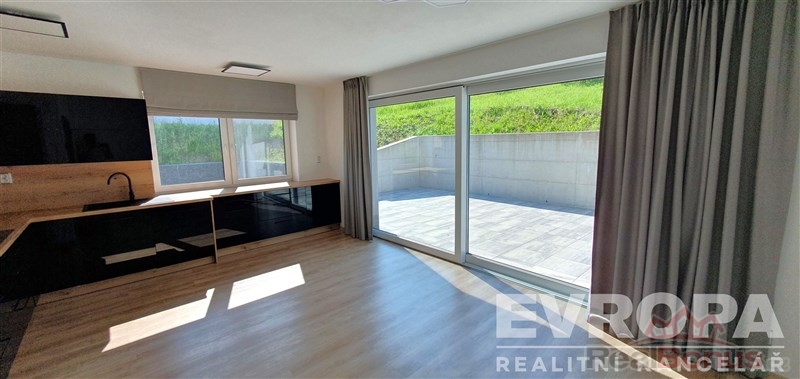Přízemí: Vstupní chodba, prostorný obývací pokoj s plně vybaveným kuchyňským koutem a přímým vstupem na slunnou terasu, koupelna se sprchovým koutem a samostatná toaleta.