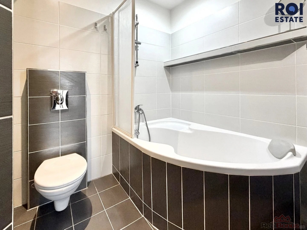 Koupelna (4,6 m2) s rohovou vanou, sprchovým koutem, umyvadlem a Geberitem