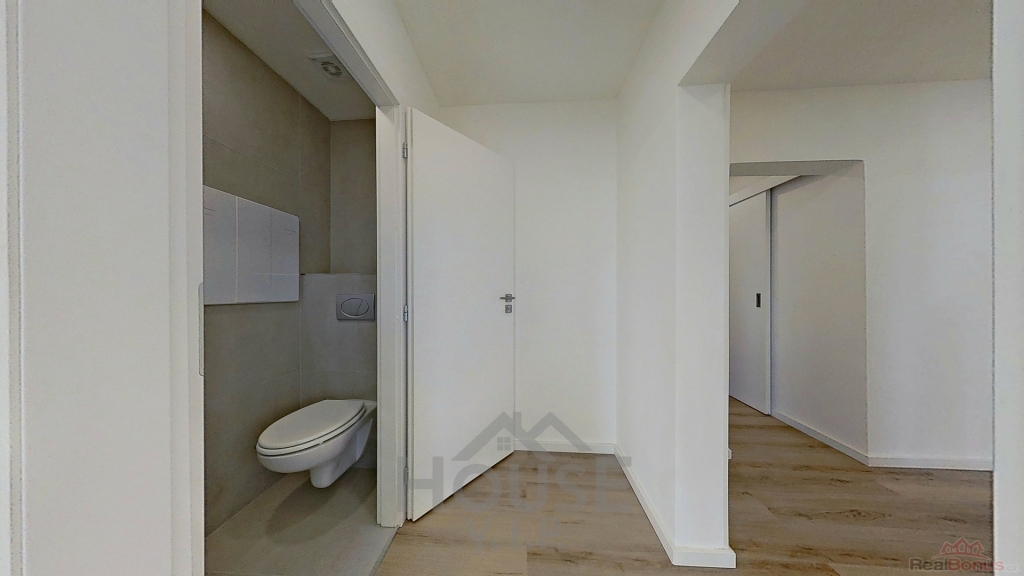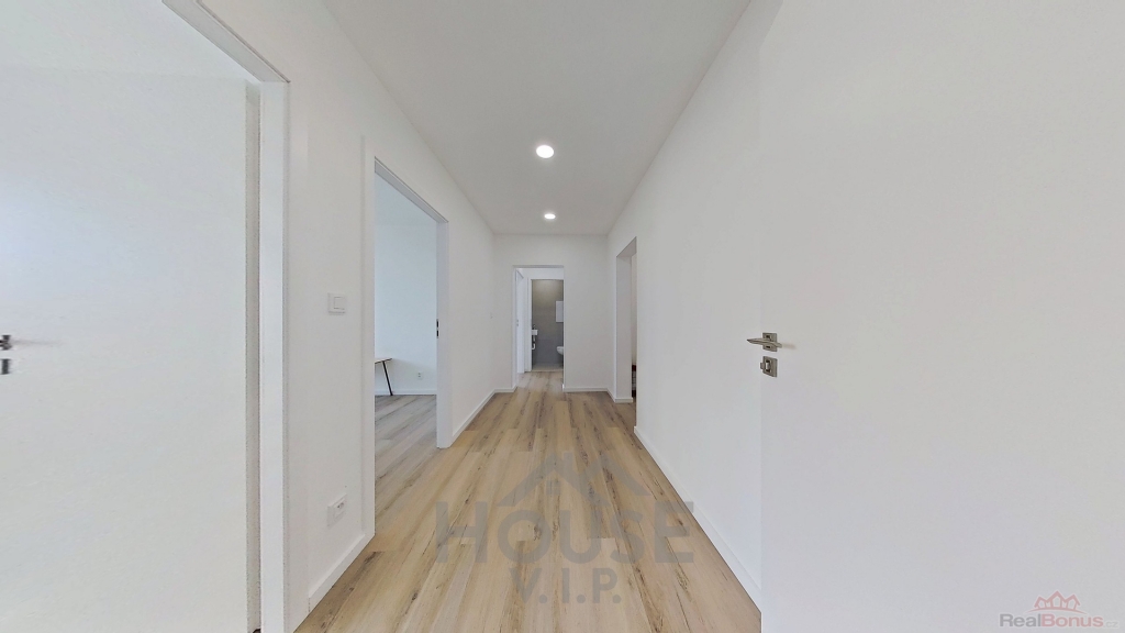 Dispozice nabízí prostornou předsíň, velký obývací pokoj s kuchyňským koutem, dva samostatné pokoje, koupelnu, samostatné WC a komoru přímo v bytě.