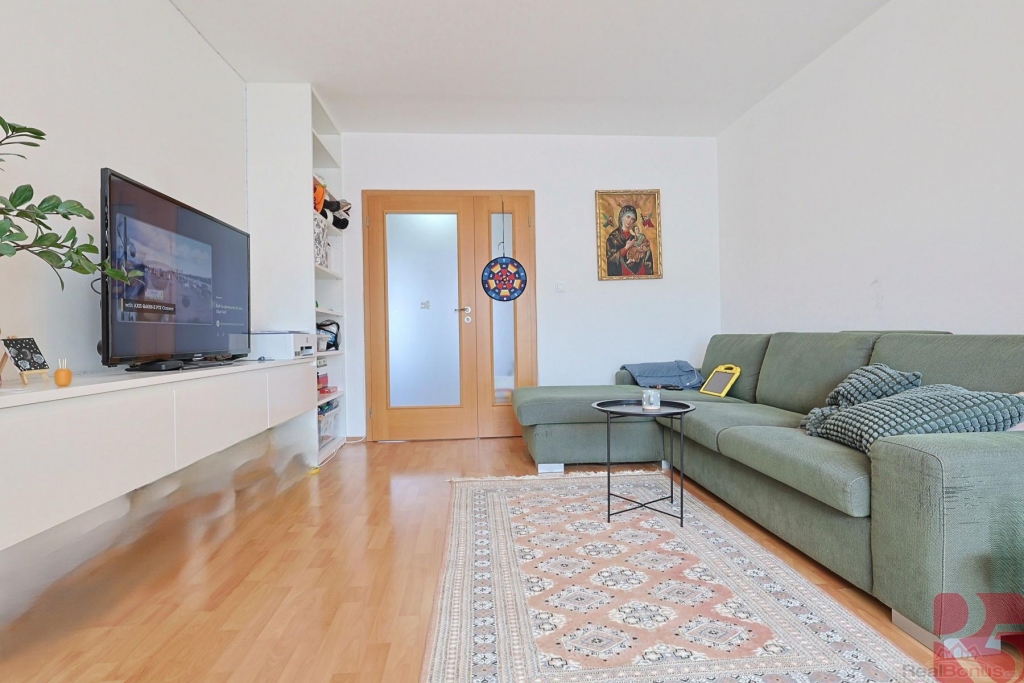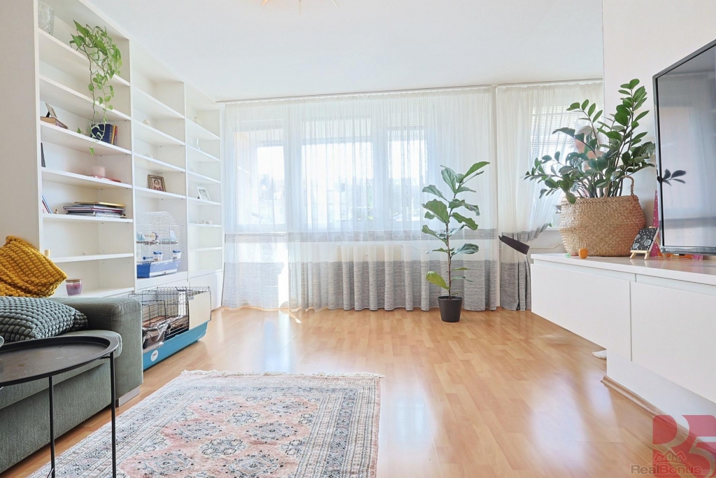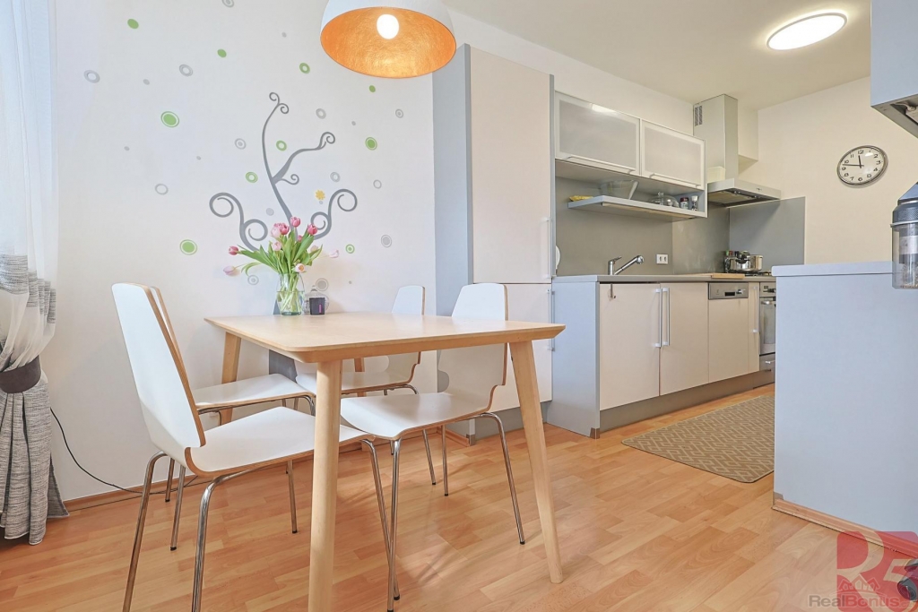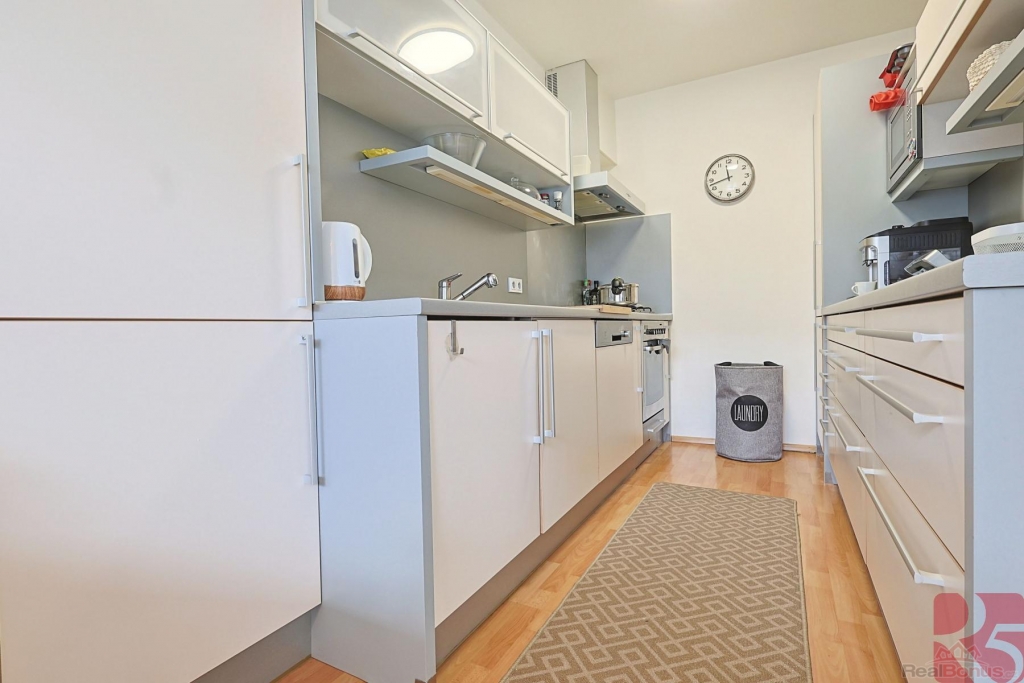 Oba pokoje, každý o rozloze přibližně 13 m2, disponují vestavěnými šatními skříněmi, které nabízejí dostatek úložného prostoru, a zároveň z nich je možné si užívat volný a inspirativní výhled až do centra Prahy. Na světlý obývací pokoj plynule navazuje jídelní část a moderně zařízená kuchyň, ze které se otevírá vstup na příjemnou zasklenou lodžii, ideální pro ranní kávu nebo večerní relaxaci.