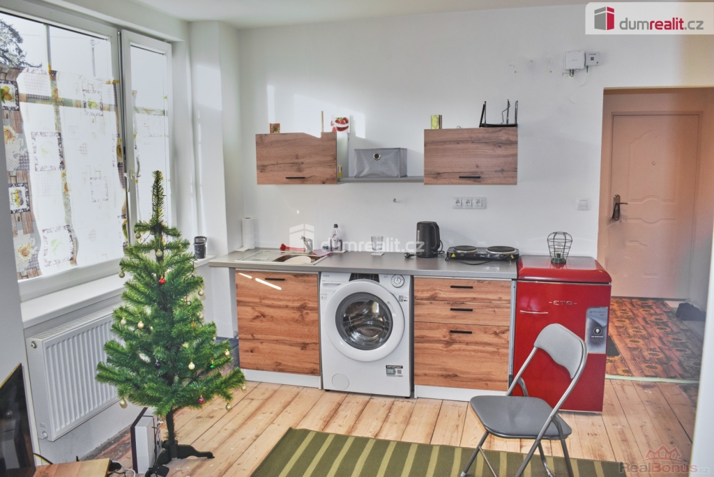 , prodej rekonstruovaného bytu o dispozici 2kk, který se nachází v klidné lokalitě s veškerou občanskou vybaveností a zároveň s výbornou dostupností do centra města i do přírody. Byt o celkové ploše 42 m včetně sklepa se nachází ve zvýšeném přízemí čtyřpatrového cihlového domu, který je součástí souvislého čtyřstranného bloku domů s obestavěným rozsáhlým vnitřním dvorem. Do bytu se vchází kvalitními bezpečnostními dveřmi, poté je z předsíně vstup do koupelny a dalších místností. Koupelna se sprchovým koutem má též umyvadlo a v samostatném výklenku wc, jsou zde 2 sklopná plastová okna. Dále vcházíme do prvního pokoje s kuchyňským koutem. Zde je decentní kuchyňská linka s dřezem, lednička i pračka (spotřebiče jsou v ceně). Byt, orientovaný na jihozápad, je ve výborném stavu po rekonstrukci. Nová elektřina v mědi, v pokojích jsou kvalitní rustikální prkenné podlahy, okna jsou plastová s trojskly. Vytápění a ohřev vody je řešeno vlastním kotlem ústředního topení, umístěným v koupelně. K bytu náleží sklepní kóje i možnost využívání společné půdy. Prostor vnitrobloku má dva vjezdy pro auta, která zde mají možnost parkování. Je zde velká travnatá plocha s odpočívkami, dětským hřištěm i možností sušení prádla. Tento byt představuje výbornou investiční příležitost, anebo možnost zřídit si zde příjemný vlastní domov.