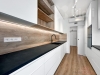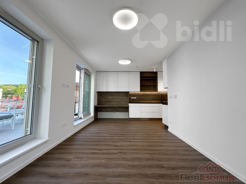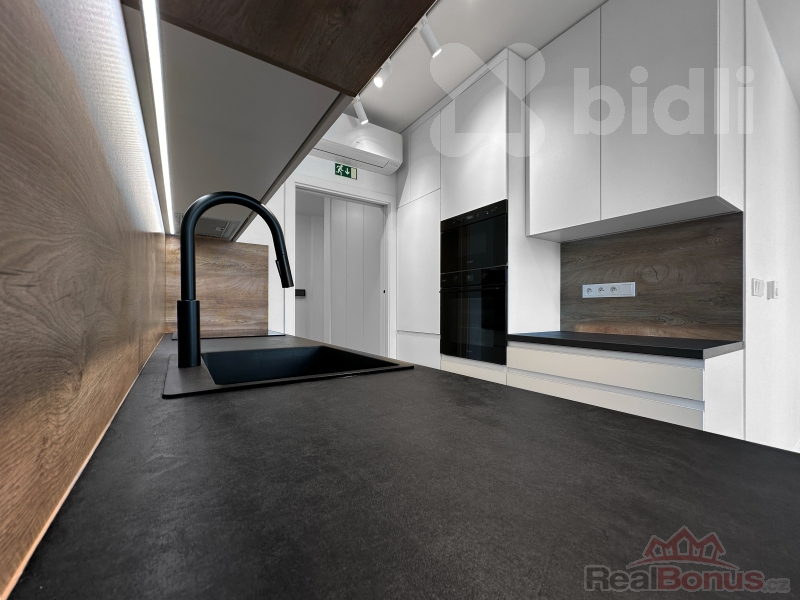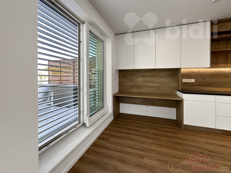 Ve výhradním zastoupení klienta Vám nabízíme exkluzivní pronájem bytu 2+kk (51 m2) s terasou (22 m2), sklepem a s vnitřním parkovacím stáním v samotném centru krajského města Zlína. Tento byt najdete v šestém nadzemním podlaží novostavby bytového domu Rezidence Lorencova. Za pomoci architektky byla majiteli upravena původně navrhovaná dispozice bytu a byl vytvořen moderní a vzdušný prostor, který je uzpůsoben k pohodlnému a nadstandartnímu bydlení. Byt je laděn do neutrálních barev, v rámci co nejlepšího využití užitných prostor bylo položeno podlahové topení. Z obývacího pokoje, který je kombinován s kuchyní, lze vstoupit na prostornou terasu, kterou v případě potřeby lze oddělit od vnitřního prostoru venkovními žaluziemi. Polodlouhý kuchyňský kout umožnil plně využít prostor na obou jeho stranách, kde byla na míru zhotovena kuchyňská linka s kompaktní černou pracovní plochou, dvířky v bílém matu se zapuštěnými úchyty a kováním s tichým dojezdem. Vše v ní má své místo, a to včetně multifunkční a mikrovlné trouby, vestavěné lednice s mrazákem, myčky, varné desky a odsavače par. Vše od značky Whirpool. Zádový panel linky byl zvolen ve stejném designu dubu alicante stejně jako vinylové podlahy v celém bytě. Mezi linku a terasu byl integrován pracovní stůl s úložným prostorem a výstupy pro elektroniku a internet (optický kabel Internext). Toto místo jistě ocení ti, kteří využívají home office. Celou společenskou zónu bytu je možno klimatizovat. V klidové zóně bytu je dostatek úložných prostor, a to jak v samostatné ložnici se severní orientací do parku, tak v předsíni. Chytře byl využit menší prostor původní toalety a byla zbudována samostatná technická místnost s pračkou. Koupelna se sprchovým koutem a toaletou dotváří ucelený moderní vzhled tohoto exkluzivního, ale velmi příjemného bydlení. Součástí nájmu a k dispozici nájemníka je garážové stání v přízemí domu, stejně jako prostorný zděný sklep. Bytový dům s výtahem o třinácti bytech byl kolaudován v roce 2024 a svým obyvatelům nabízí velmi klidné a pohodové bydlení se všemi výhodami, které centrum města Zlína nabízí. Přijďte se sami o kvalitách tohoto bydlení přesvědčit, naše makléřka Vás ráda nabízeným bytem provede.