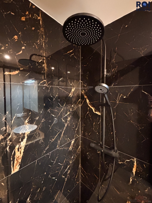 Designová koupelna: Skutečná dominanta bytu. Kombinace luxusního černého mramoru a moderních doplňků vytváří atmosféru soukromého wellness.
