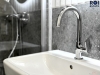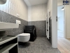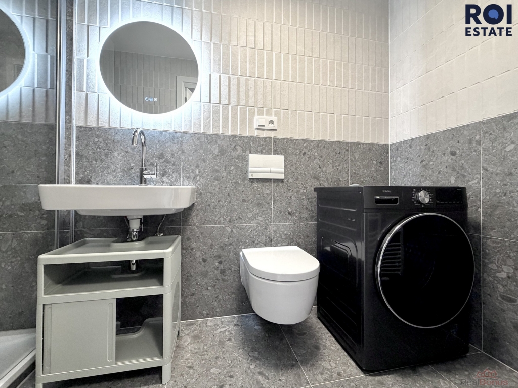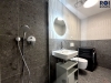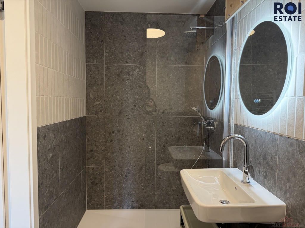 Koupelna je v designovém moderním provedení s prostorným sprchovým koutem a podsvíceným zrcadlem.