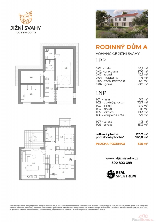 1.NP: hala (8,5 m2), obývací pokoj s kuchyňským koutem (32,3 m2) a vstupem na terasu (15,3 m2), pokoj (15,4 m2), pokoj (11,6 m2), ložnice (19,3 m2) s terasou (4,3 m2), koupelna s WC (5,7 m2)