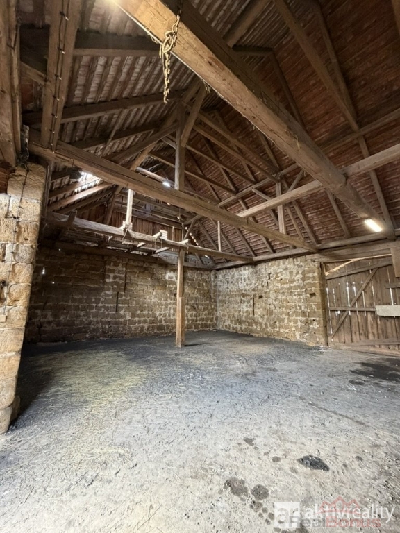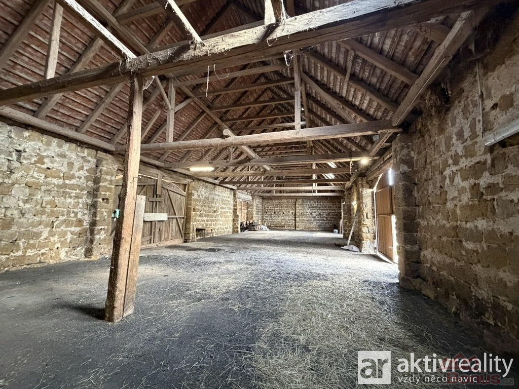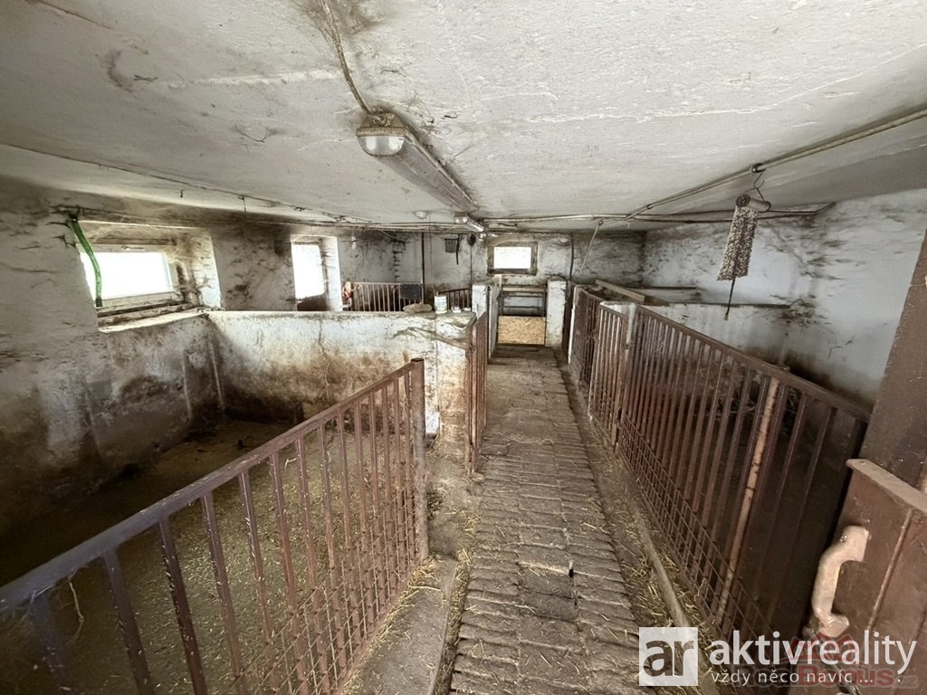 Naproti obytné části se nacházejí dvě hospodářské budovy ? menší a větší chlévy, které jsou v dobrém technickém stavu. Větší chlév má přibližně 320 m2, menší okolo 35 m2. Obě stavby mají pevné zdivo, jsou suché a stabilní, a nad nimi se rozkládá rozsáhlý půdní prostor vhodný pro skladování nebo další využití. Na stodolu dále navazuje vysoký otevřený přístřešek o ploše přibližně 122 m2, který nabízí další prostor například pro techniku či materiál.