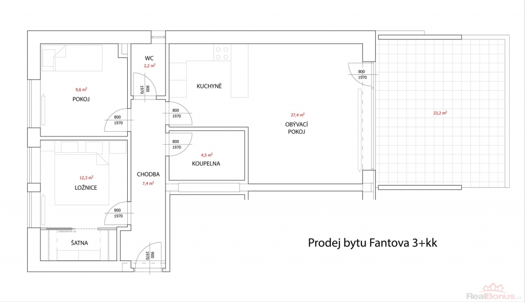 Dispozice bytu: chodba (7,4 m2), ložnice (12,3 m2), pokoj (9,6 m2), toaleta (2,2 m2), koupelna (4,5 m2), kuchyně s obývacím pokojem (27,4 m2), terasa (23,2 m2)