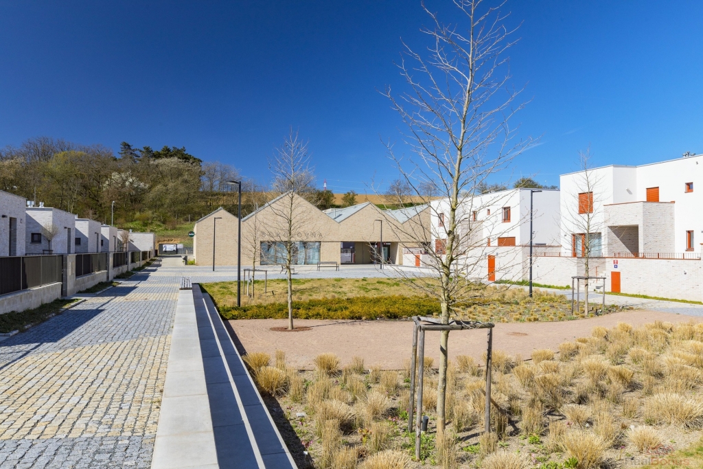 Nový jednopodlažní dům o dispozici 4+kk (127 m2) + 56 m2 terasa + 11 m2 venkovní sklad, vstupní portál 5 m2 a dvě parkovací stání před domem.