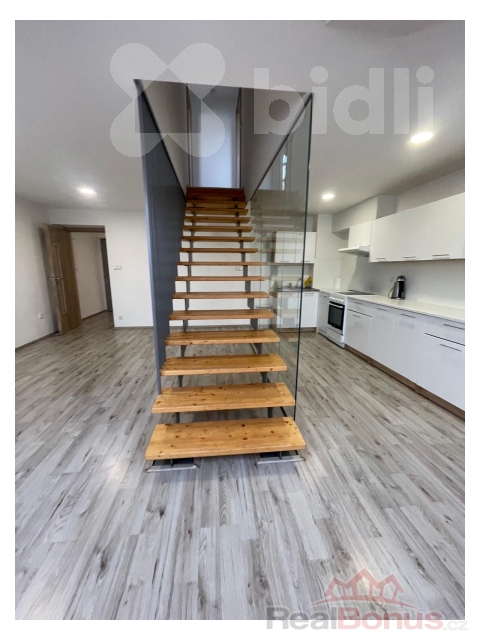 Ve spodním podlaží bytu se nachází prostorný obytný prostor s kuchyňským koutem, který nabízí dostatek místa pro obývací i jídelní část. Dominantou interiéru je schodiště vedoucí do horního patra.