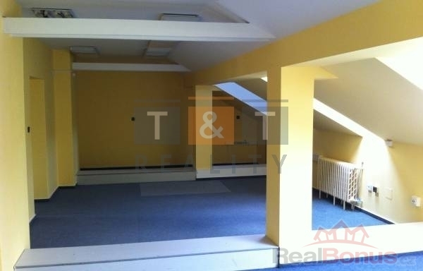 Díky svému umístění v nejvyšším, tj. 4. np, poskytuje dostatek klidu jak v pracovní době, tak i pro případný odpočinek. Jedna z místností je v klasickém provedení, druhá je v podkrovní úpravě a může výborně posloužit i jako společenská místnost. Rozměrově jsou místnosti řešené o ploše 44 a 53,4 m2. V rámci pronájmu je k dispozici i část společných prostor o 10 m2 (kuchyňka). Celkem tedy 107,5 m2.
