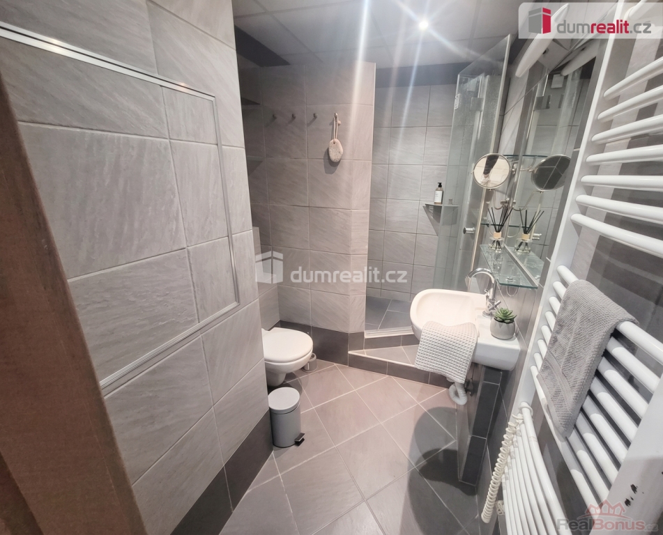 Po rekonstrukci vás nadchne velkorysý, vyzděný sprchový kout laděný do nadčasových šedých tónů.