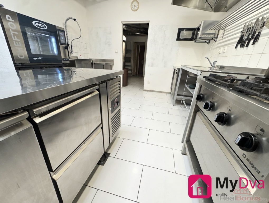 Kuchyně je kompletně vybavena profesionální gastronomickou technologií, která umožňuje okamžitý provoz bez nutnosti dalších investic. K dispozici je mimo jiné konvektomat UNOX, gril, fritéza, plynový sporák o výkonu 22 kW, chladicí pulty, digestoře se vzduchotechnikou, myčka nádobí, lednice, mrazicí boxy a další potřebné vybavení. Nechybí ani výčepní zařízení, režon na talíře a infra technologie.