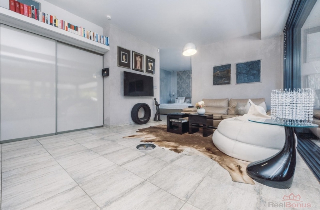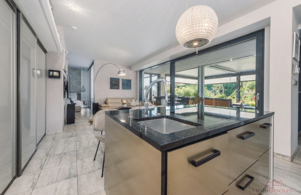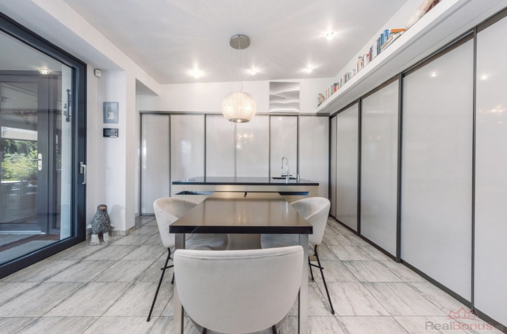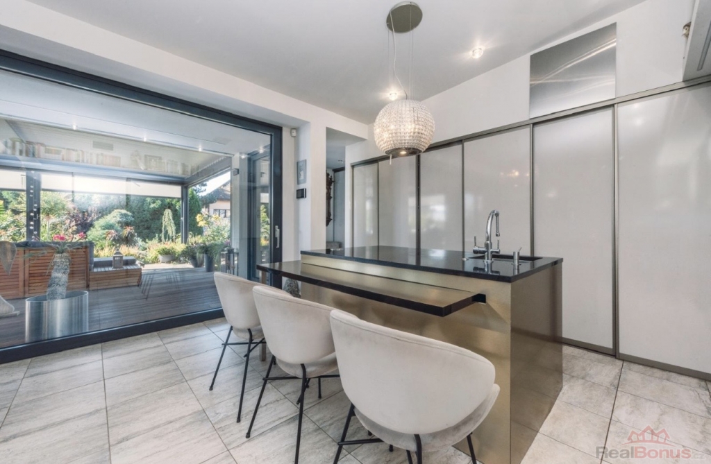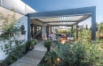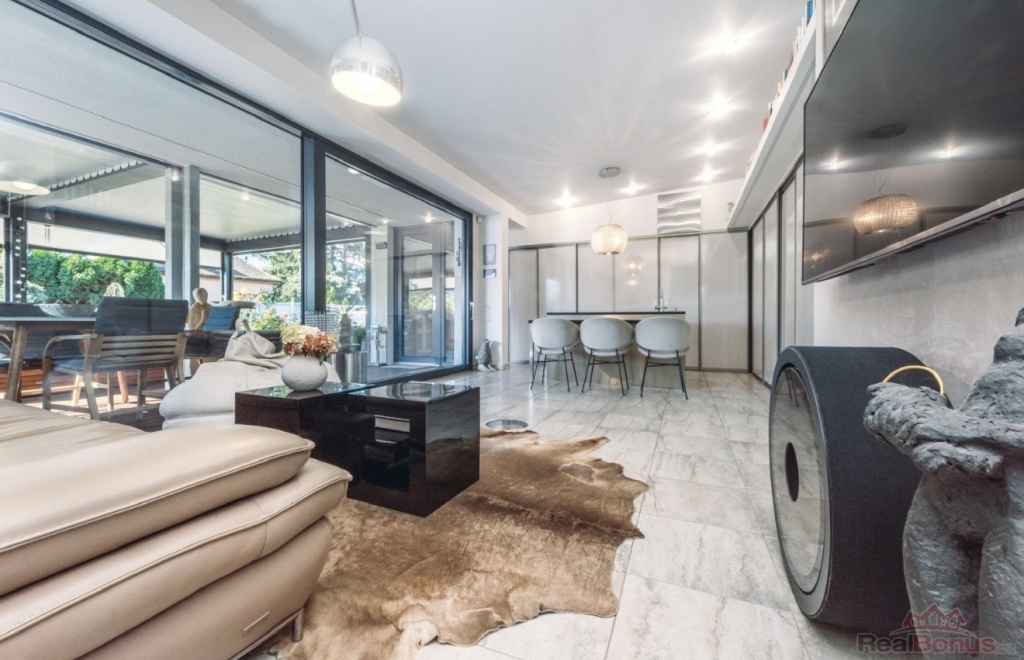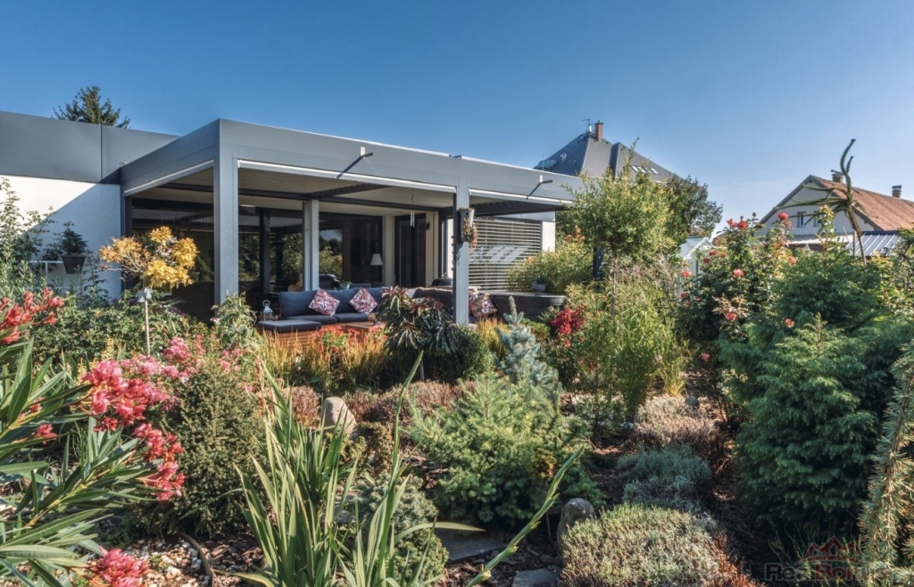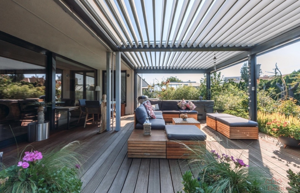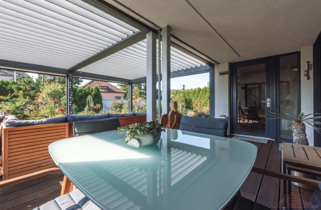 Na obytnou část navazuje krytá terasa s bezúdržbovou bioklimatickou hliníkovou pergolou o rozměrech , která umožňuje využívat venkovní prostor po většinu roku. Do terasy je zabudovaná vířivá vana pro dvě osoby. Pečlivě založená zahrada nabízí dostatek soukromí, klidovou zónu i užitkovou část s ovocnými stromy, skleníkem a zahradním domkem v zadní části domu.