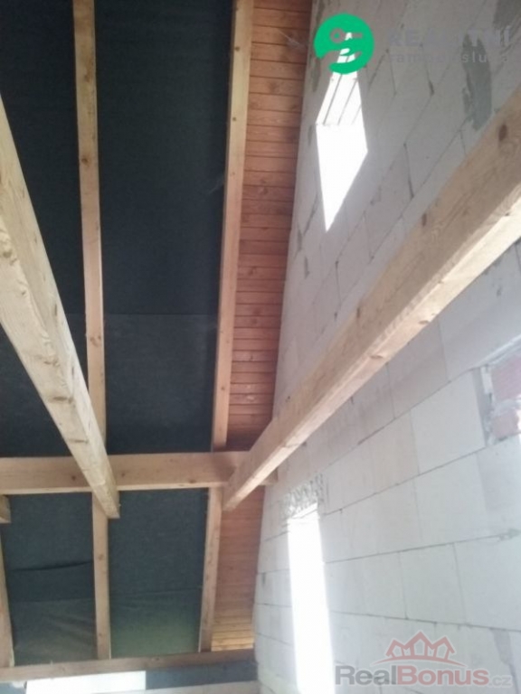 1PP (částečně odkryté mírný svah), 1NP, podkroví, obytná půda. Stavba je z keramických tvarovek s plánovaným zateplením. Stropy Spirol, vnější úprava dle projektu kombinace bílé omítky a dřevěného obkladu s možností změny před dokončením. Střecha s plechovou krytinou (r.2023) 10 let záruka. Podzemní části jsou zatepleny XPS 10 cm a chráněny dvouvrstvou SBS hydroizolací. Komín je stavebnicový s nerezovou vložkou. Interiérové tesařské konstrukce střechy s již hoblovanými vodorovnými nosníky (kleštiny) a podpěrnými trámy, plánované jako pohledové; podbití přesahů střechy na všech štítech hotové s povrchovou úpravou. Dispozice interiéru není dokončena, lze upravit dle vlastních potřeb.