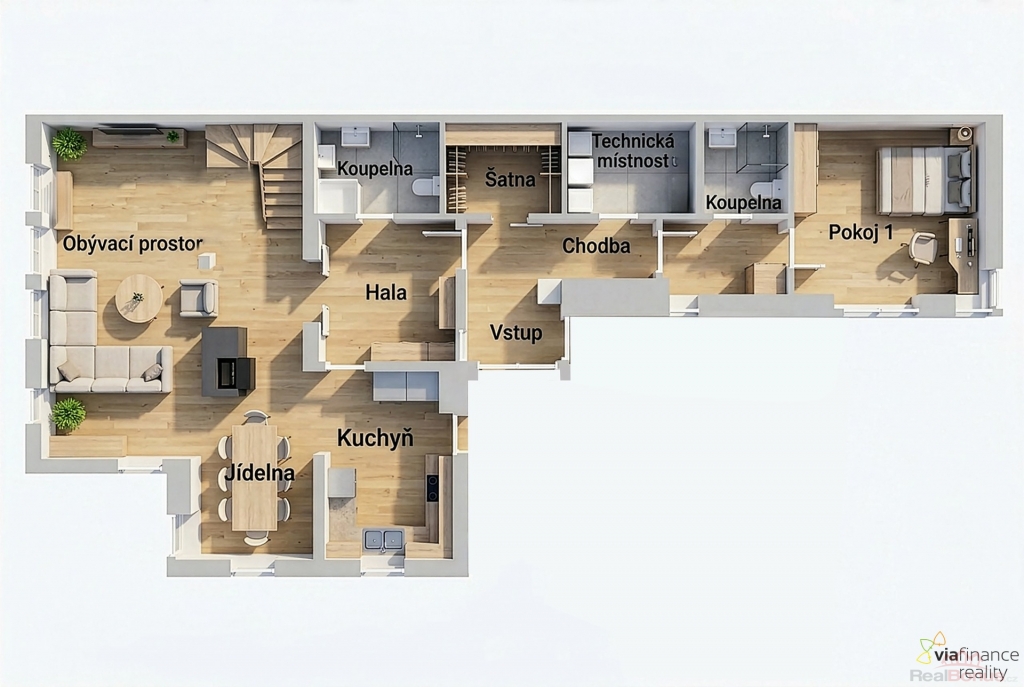 přízemí - vstupní hala, šatna, obývací pokoj, kuchyňský kout, technická místnost(špajz)