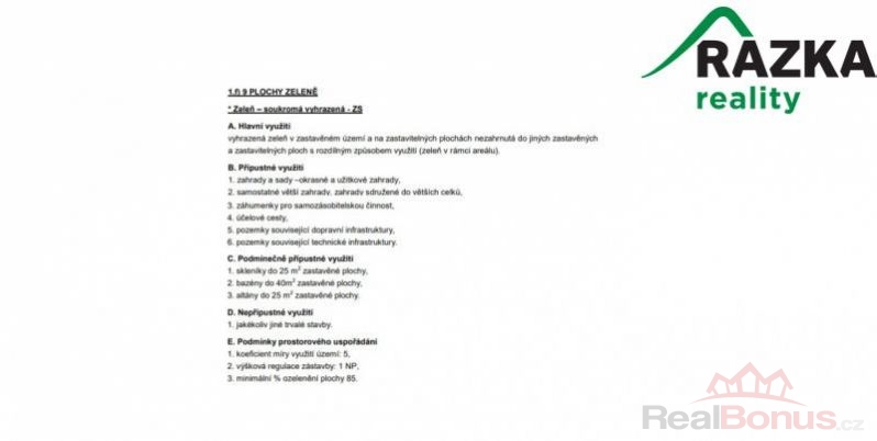 Dle platného územního plánu je pozemek zařazen do kategorie "Zeleň - soukromá vyhrazená". Hlavním využitím pozemku je vyhrazená zeleň v zastavěném území a na zastavitelných plochách nezahrnutá do jiných zastavěných a zastavitelných ploch s rozdílným způsobem využití. Avšak zažádáním o změnu územního plánu je možné kategorii zařazení pozemku změnit.