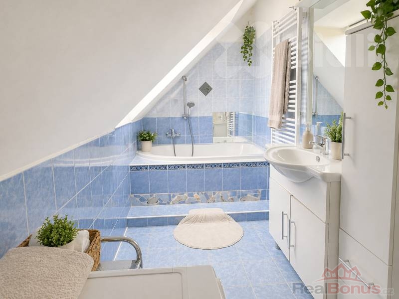 Podkroví rozšiřuje obytnou část domu o prostorný obývací pokoj s jídelním koutem, šatnu, ložnici, koupelnu, samostatné WC a další dva pokoje. Celkové uspořádání domu tak vyhoví větší rodině i zájemcům, kteří hledají dostatek prostoru, soukromí a variabilní využití jednotlivých místností.