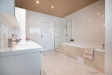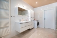 koupelna s vanou, sprchovým koutem, toaletou, bidetem, umyvadlem a tepelným žebříkem. Zvláště je pak umístěna spižírna a samostatná toaleta (pro hosty). Podlahová krytina tvořena laminátovou plovoucí podlahou a dlažbou. Nadstandardní interiérové dveře (s magnetickým