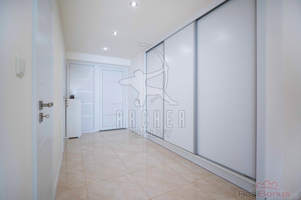 Dům nabízí prostornou vstupní chodbu s vestavěnými skříněmi, s přímým vstupem do přilehlé garáže (1 vůz). Chodba vede do velkoryse řešeného, světlého obývacího pokoje (haly) s plně vybaveným kuchyňským koutem (sklokeramická deska, elektrická trouba, digestoř,