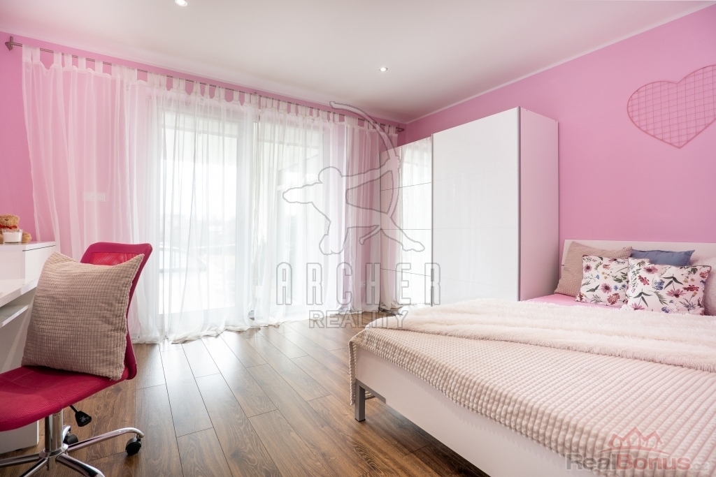 myčka, lednice s mrazákem), s přímým vstupem na krytou zahradní terasu s posezením. Součástí obývacího pokoje je krb na dřevo, dotvářející příjemnou atmosféru domova. 2 dětské pokoje jsou s přímými vstupy na terasu, oddělená ložnice. Nedílnou součástí je prostorná