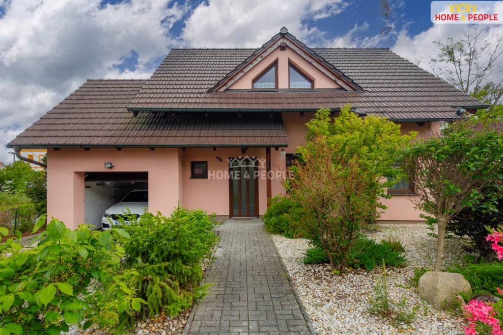 Součástí domu je také garáž s moderními sekčními vraty na dálkové ovládání a dalším úložným prostorem. Parkovat můžete pohodlně i před garáží.