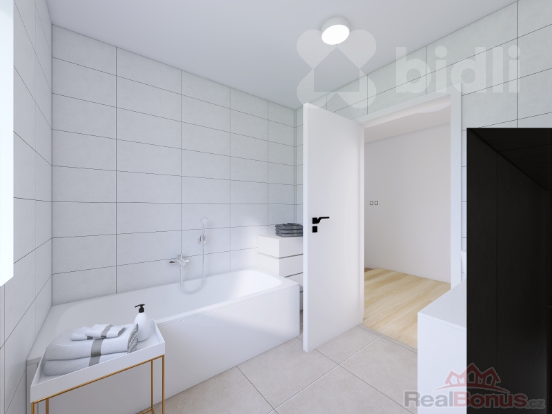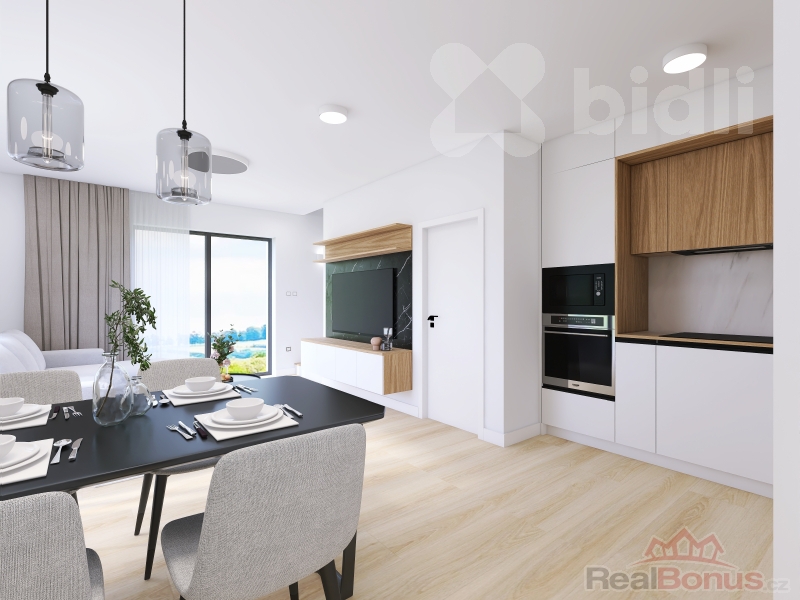 Nabízíme k prodeji moderní bytovou jednotku o dispozici 3+kk a podlahové ploše 85,5 m2, která se sestává z 1 nadzemního podlaží a podkroví komorního trojdomu v rámci developerského projektu v obci Dýšina.