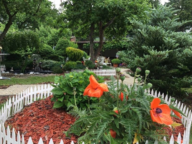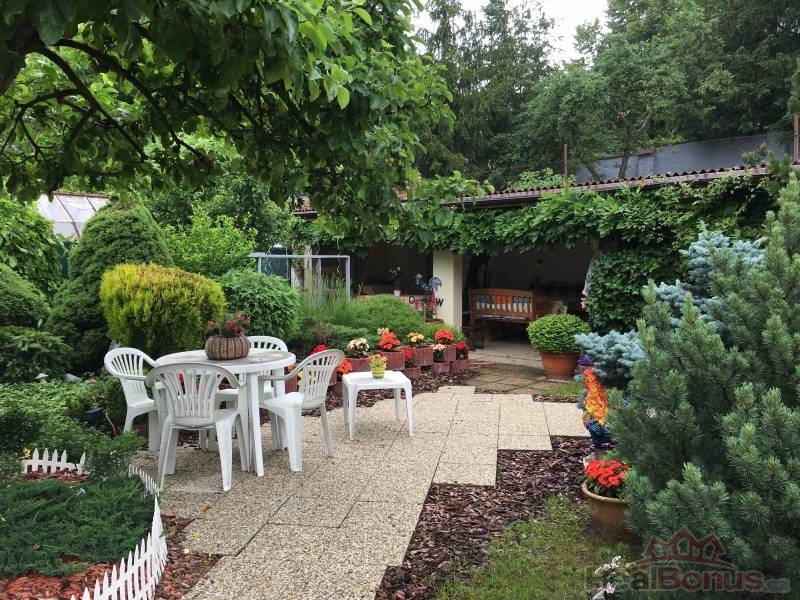 Za domem velice vkusná a bohatá okrasná zahrada s ovocnými stromy a okrasnými dřevinami . Letní kuchyně s pergolou, včetně přípojky vody a el.