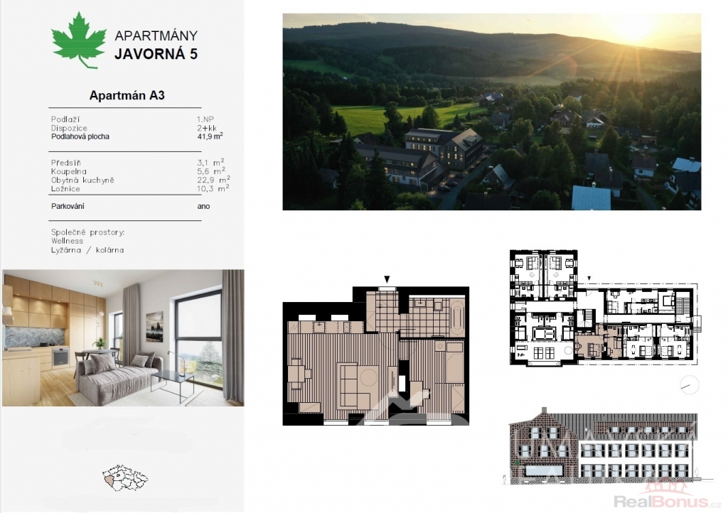 Popis domu: komplexní rekonstrukcí bývalého hotelu vznikl nádherný a moderní bytový dům od architekta nominovaného na Českou cenu za architekturu. Součástí je vlastní zázemí s kolárnou a lyžárnou. Dům má moderní architektonickou tvář, je dokonale zateplený, okna jsou plastová s izolačním trojsklem v antracitovém odstínu. Topení zajišťují tři moderní, inteligentní a účinná tepelná čerpadla vzduch/voda zn. NIBE F 2040. Samozřejmostí je i vlastní parkoviště s vymezeným stání pro jednotlivé byty. Kolaudace domu proběhla v prosinci 2022 a ve dvou objektech je celkem 40 bytových jednotek. Napojen je na obecní vodovod a kanalizaci, zajištěna je i správa domu s úklidem a zimní údržbou parkoviště. Správa domu může dokonce zajistit i komerční pronájem apartmánu v době, kdy by ho vlastník nevyužíval tím se z apartmánu stává výnosová investice!