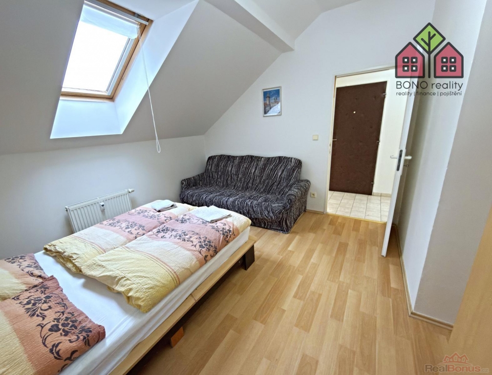 Interiér: Světlý podkrovní prostor s terasou (10,68 m and sup2;) a výhledem do přírody.