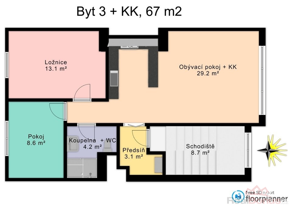 Pokoje: Dvě samostatné ložnice (13,1 m2 a 8,6 m2).