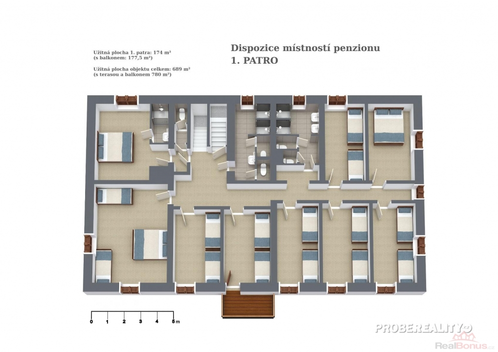 Užitná plocha: 689 m2 (2 nadzemní podlaží + podkroví), s terasou a balkonem 780 m2