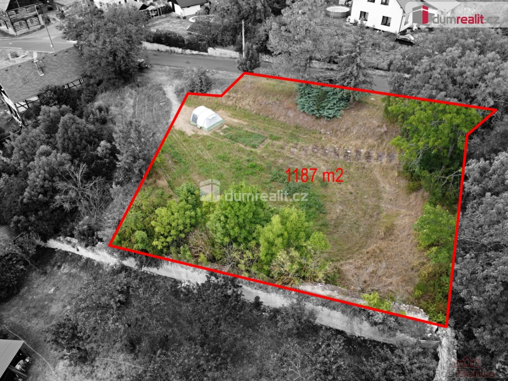 Rovinatý pozemek v klidné části a na konci obce je o rozloze dle KN 1187 m přístupný z hlavní komunikace.