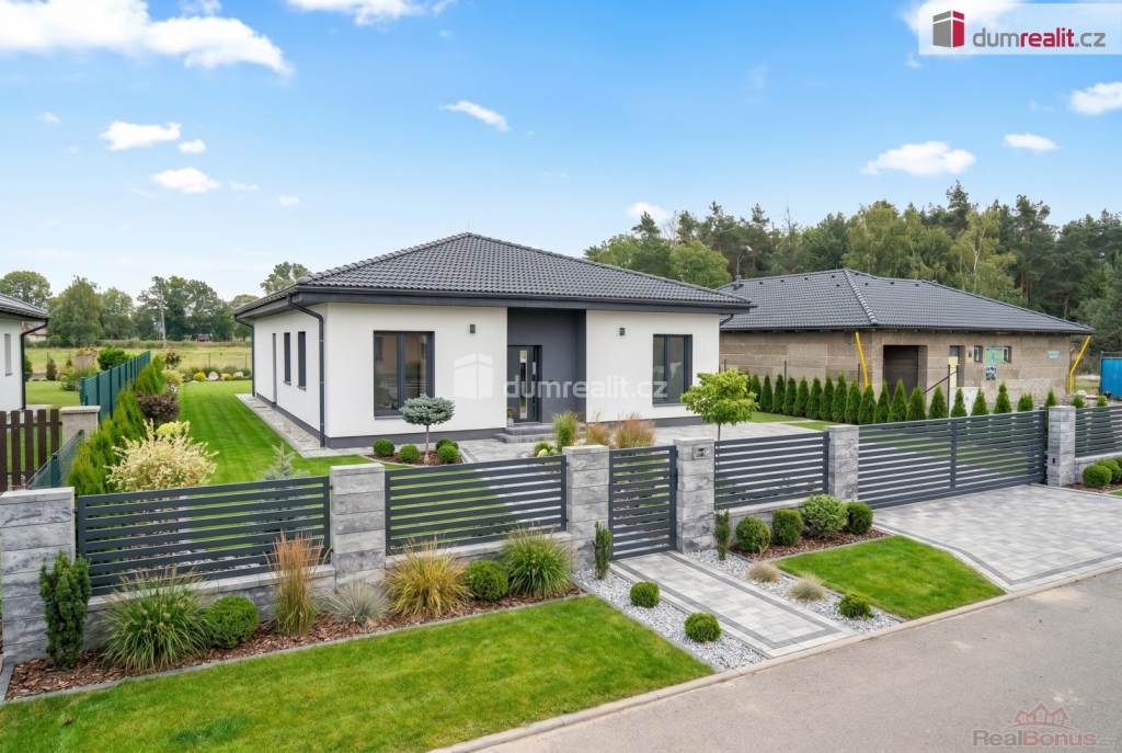 Včetně právního, realitního a kompletního servisu., v exkluzivním zastoupení prodej moderní, zděné novostavby rodinného domu o dispozici 5+kk, situované v klidné a vyhledávané lokalitě obce Hrobice, pouhých 12 minut od Pardubice a 13 minut od Hradec Králové. Jedná se o přízemní bungalov o podlahové ploše 170 m na pozemku o velikosti 732 m, který nabízí ideální kombinaci komfortu, soukromí a moderních technologií pro rodinné bydlení.