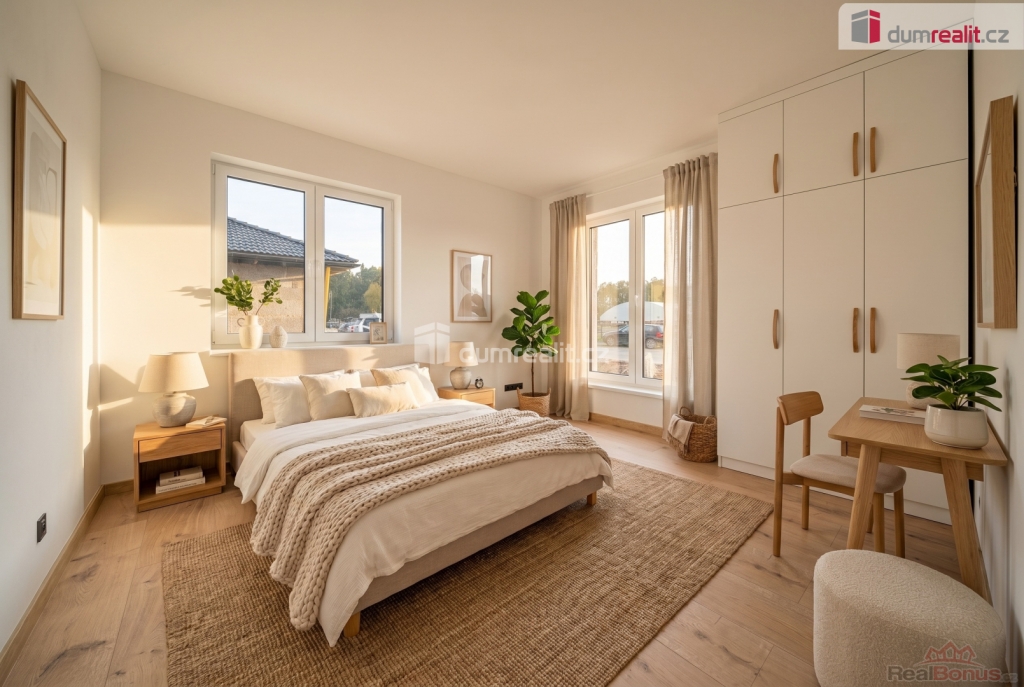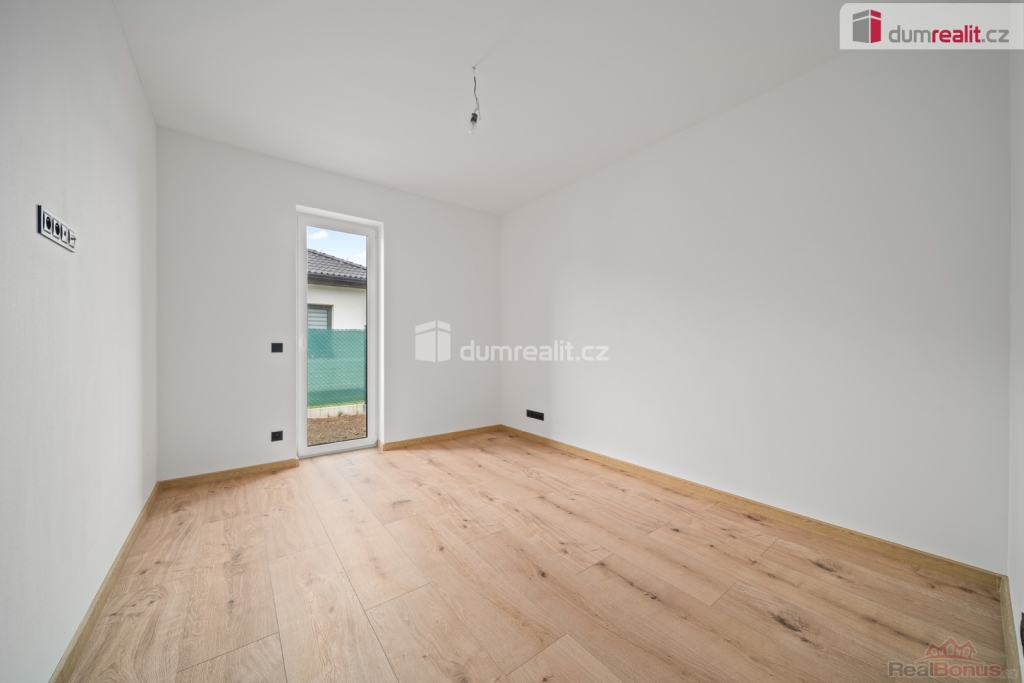 Dispozičně je dům řešen jako prostorný bungalov s dominantním obytným prostorem a kuchyňským koutem, který tvoří hlavní centrum domu. Dále jsou k dispozici samostatné pokoje, koupelna a technické zázemí. Nemovitost je připravena k dokončení interiéru dle individuálních představ nového majitele, což umožňuje přizpůsobení finální podoby bydlení přesně podle vlastního vkusu a potřeb.