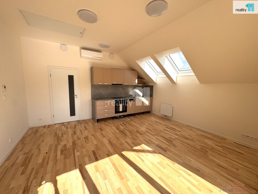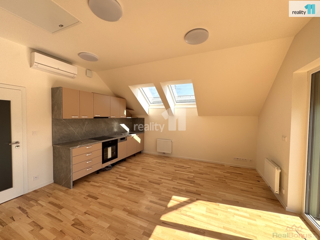 Nezařízený byt, s výměrou 53.7 m, je dispozičně rozdělen na vstupní chodbu, ze které se vchází do slunného obytného pokoje, kde je nová kuchyňská linka na míru (varná deska, trouba, digestoř, myčka, lednice po dohodě), se střešními okny a vstupem na prostorný balkon (výměra 11.4 m). Samostatná ložnice, koupelna s vanou a toaletou. Do chodby byla instalována vestavná skříň ve stejném designu jako je kuchyně. V celém bytě použity kvalitní, moderní materiály v neutrálních barvách - dřevěné podlahy, rekuperace, podlahové topení v koupelně, klimatizace. Velkou výhodou bytu je úložný prostor přístupný sklápěcími schody přímo v bytě, dále velký zděný sklep (2.1 m) a vlastní parkovací stání se závorou.