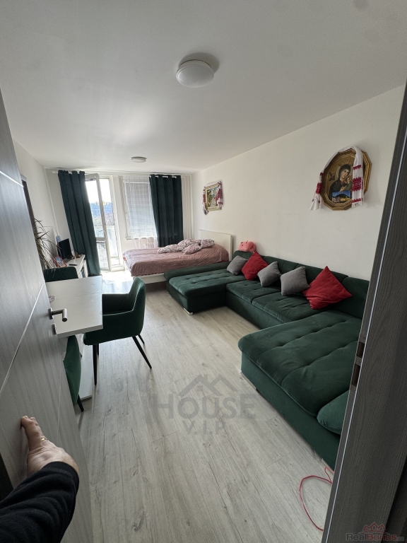 Byt zůstane původně vybavený - zelená sedačka, zelené židle, TV stolek, jídelní stůl, stůl v pracovně, skříň v ložnici, noční stolky. V bytě jsou do konce května nájemníci, takže byt je na některých fotografiích vybaven dle jejich vkusu (červené kusy nábytku/doplňků).