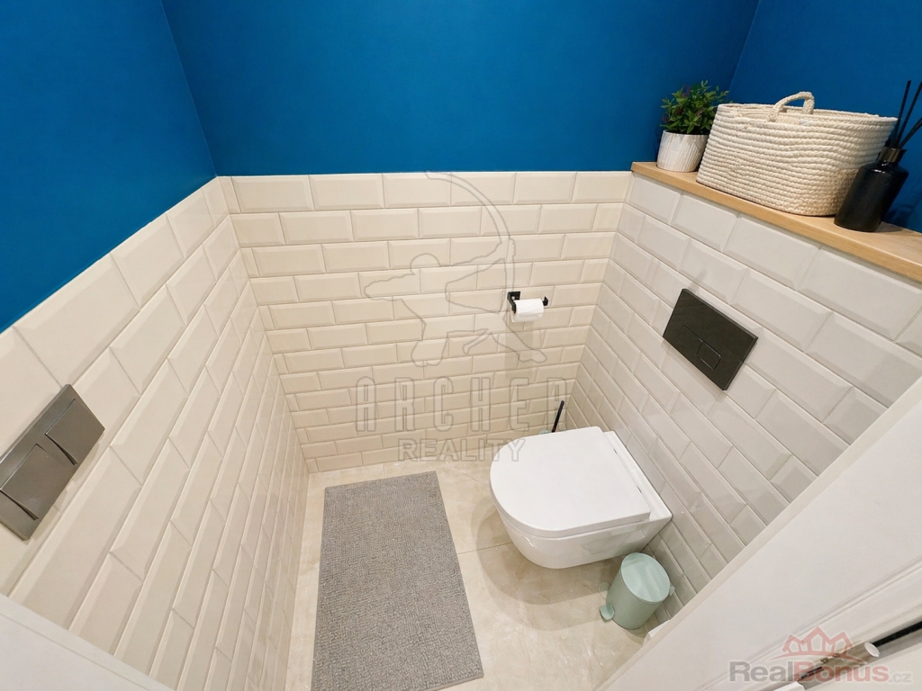 Ostatní místnosti jsou s obývákem propojené otevřenou chodbou. Dvě ložnice mají výhled do parku Klamovka. Koupelna a toaleta jsou barevně sladěné s kuchyní a obývákem kombinací barev bílé a modré. Toaleta je samostatná. Koupelna nabízí vanu i sprchový kout. Rozloha bytu je 68,8m2 plus 9m2 lodžií.