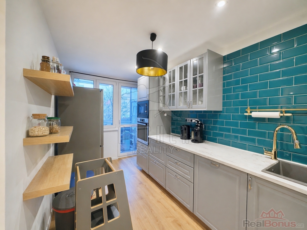 Na obývací pokoj navazuje stylová, plně vybavená kuchyně s vestavěnými i volnými spotřebiči. Je prosvětlená velkým oknem přes druhou lodžii.