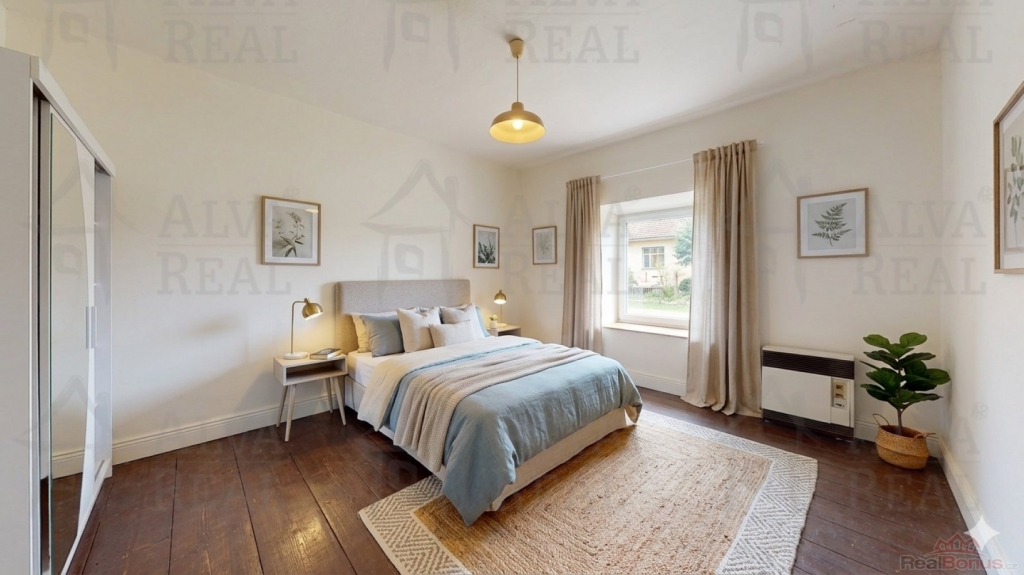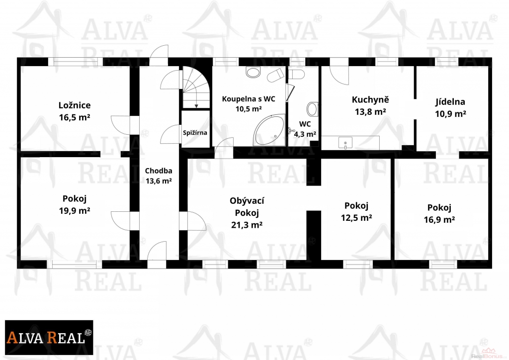 Dispozice: Obývací pokoj 21,3 m?; pokoj 19,9 m?; pokoj 16,9 m?; ložnice 16,5 m?; kuchyně 13,8 m?; chodba 13,6 m?; pokoj 12,5 m?; jídelna 10,9 m?; koupelna s WC 10,5 m?; WC 4,3 m? a spižírna. Přibližná podlahová plocha domu je 140 m?. Výměry jsou orientační, měřené přístrojem Matterport.