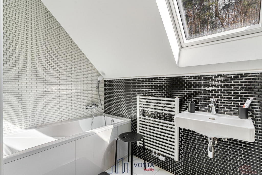 Vila je podsklepená (74,9 m2). Suterén nabízí čisté prostory pro technologii, sklady prádla, úschovnu kol/lyží nebo potenciál pro vybudování vlastního privátního wellness zázemí nebo posilovny.