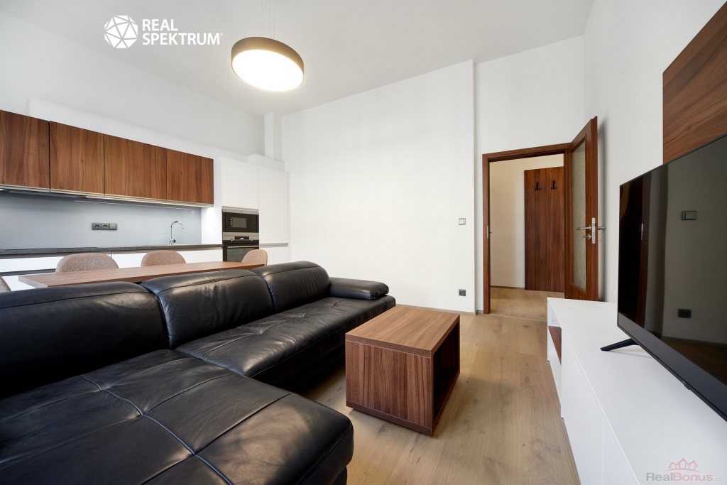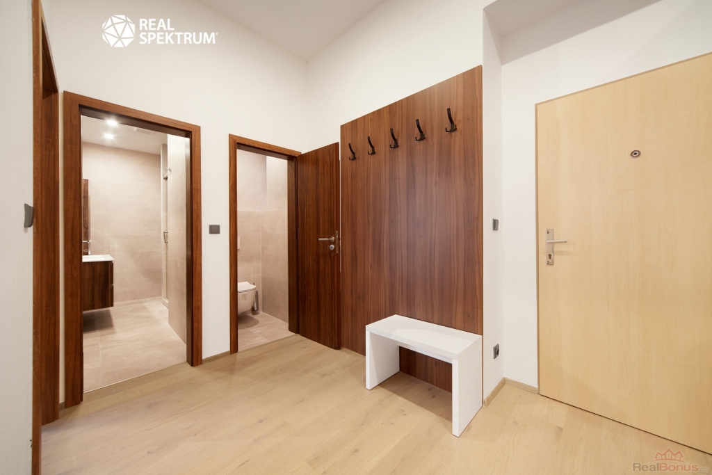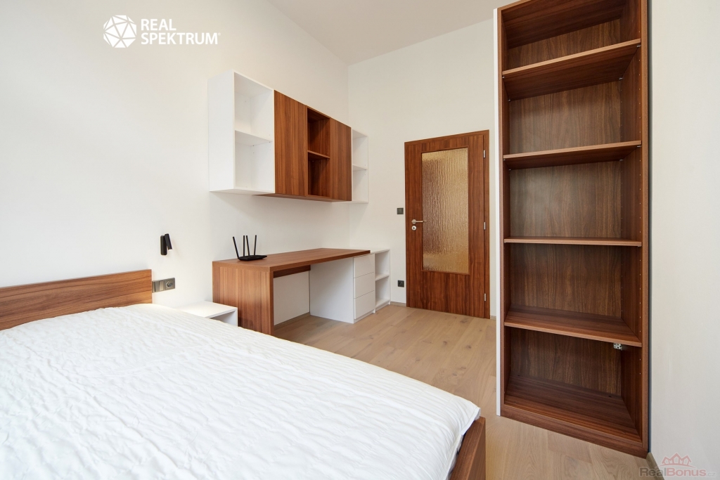 Tento stylový byt se nabízí plně vybavený, kde máte k dispozici moderní kuchyňskou linku se spotřebiči (indukční deska, trouba, digestoř, mikrovlnka, myčka lednice s mrazničkou), jídelní stůl, židle, obývací prostor se sedací soupravou, konfe. stolkem, tv stěnou a TV. Byt má k dispozici dvě oddělené vybavené ložnice a každá z nich má manželskou postel, pracovní stůl, skříň a úložné prostory. Další úložné prostoty jsou ve vstupní chodbě a v šatně.