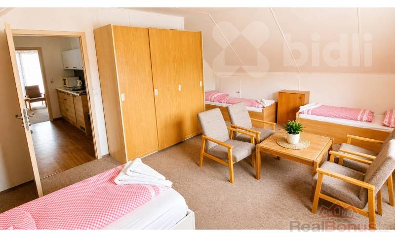 Jedná se o podkrovní byt, který je jedinou bytovou jednotkou v podkroví domu, zatímco v prvním nadzemním podlaží se nacházejí další dva byty. Dispozičně je byt řešen tak, že po vstupu po schodišti se dostanete do centrální části bytu, kde se nachází kuchyně. Kuchyně tvoří hlavní obytný prostor uprostřed bytu, odkud je přístup do jednotlivých pokojů - vlevo se nachází větší pokoj a z druhé strany menší pokoj. Součástí bytu je koupelna se s vanou a toaletou. Byt je vybaven dle fotografií, lze vystěhovat nábytek dle potřeb nájemce. Dům je zateplen a vybaven novými okny, což přispívá k příjemnému a úspornému bydlení. K domu náleží vlastní parkoviště, pozemek není oplocen.
