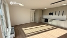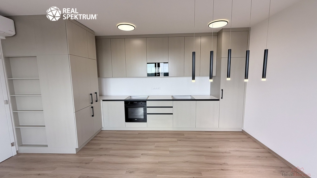 Interiér bytu nabízí vstupní chodbu se zádveřím a vestavěnou skříní, obývací pokoj je spojený s kuchyní a jídelnou. Kuchyňská linka má lakovaný matný povrch s kamennou deskou, je vyrobena na míru a vybavena kvalitními vestavnými spotřebiči značky Siemens.