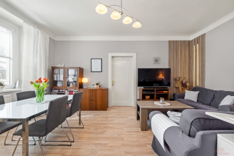 Byt se nachází ve 3. patře domu s výtahem. Obytná plocha činí 76,5 m2 a k jednotce náleží také velký zděný sklep o velikosti 5,7 m2. Světlá výška stropů 2,8 m dodává interiéru příjemný pocit prostoru.