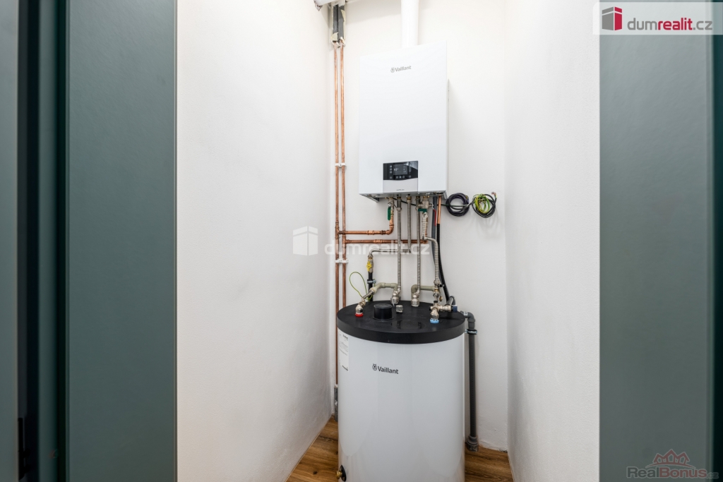 Kromě plynového kotle oceníte i krbová kamna v obývací části s rozvodem tepla do podkroví ideální kombinace efektivity a atmosféry.