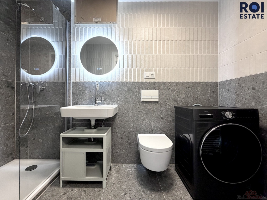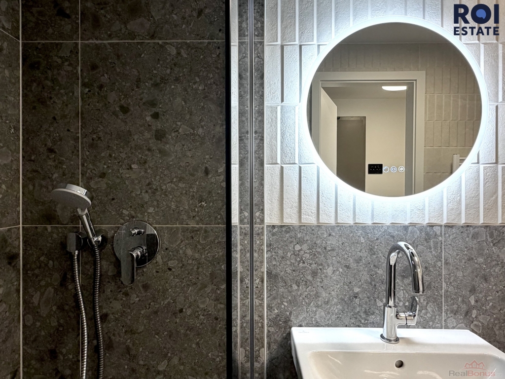 Koupelna je v designovém moderním provedení s prostorným sprchovým koutem a podsvíceným zrcadlem.